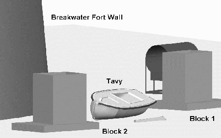 The chosen site contained a number of fixed and rigid structures suitable for recording. These included two large concrete blocks, the wall of the Fort itself (Fig. 2, Fig. 3) and a 7 m long ex-Pilot cutter called Tavy which had been sunk deliberately for this experiment. A network of 21 control points was installed on the structures (Fig 4), the shape was designed to give a large amount of redundancy and minimal sensitivity to errors in depth measurements. The control points installed on the structures were 5mm galvanised coach bolts cemented into pre-drilled holes; the diameter of the control point bolts was accounted for within the processing program.