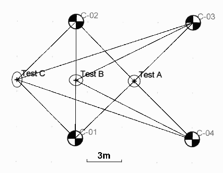 Knowing the typical precision of a tape measurement we can calculate the accuracy with which we can position any point on the site. The accuracy of the position of a point is expressed as error ellipse based on both the precision of the associated distance measurements and the position of the point within the control network. The ellipse is an approximate graphical representation of the horizontal accuracy in all directions. Error ellipses are commonly shown at 2.447 times their 1 SD values and are then referred to as 95% confidence regions, so there is a 95% confidence that the point lies within that ellipse. The sizes of the error ellipses computed by the adjustment program are directly related to the size of the standard deviation defined for the tape measurements. The standard deviation also sets the maximum acceptable residual so a small standard deviation gives a small size of error ellipse but requires better quality measurements to achieve it. A simulated network of four fixed control points was set up with a test point A in the centre, Test B on a baseline between two control points and Test C outside the control network (Fig. 8). The position error ellipses are shown 20 times full scale. The accuracy of the position of a set of points was then calculated based on the given precision of 25 mm (Table 2).